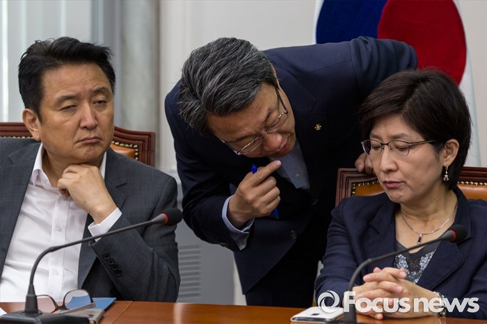 (서울=포커스뉴스) 김성식(가운데) 국민의당 정책위의장과 박주현(오른쪽) 최고위원이 20일 오전 서울 여의도 국회에서 열린 최고위원회의에 참석해 대화를 나누고 있다.