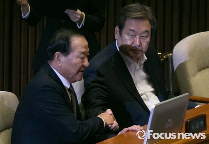 (서울=포커스뉴스) 20일 오전 서울 여의도 국회에서 열린 343회 국회(임시회) 3차 본회의에 참석한 김무성(오른쪽) 새누리당 전 대표와 서청원 전 최고위원이 인사하고 있다.