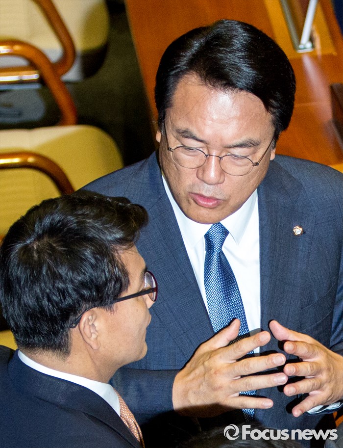 (서울=포커스뉴스) 정진석(오른쪽) 새누리당 원내대표와 윤상현 새누리당 의원이 20일 오전 서울 여의도 국회에서 열린 본회의에 참석해 대화 하고 있다.