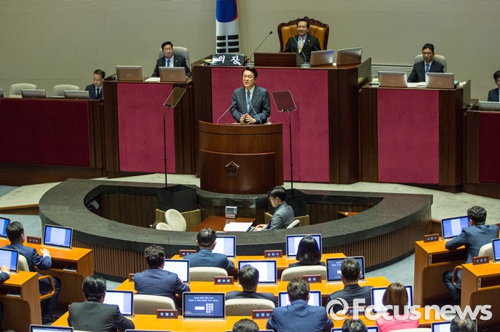 (서울=포커스뉴스) 정진석 새누리당 원내대표가 20일 오전 서울 여의도 국회에서 열린 본회의에 참석해 교섭단체 대표연설을 하고 있다.