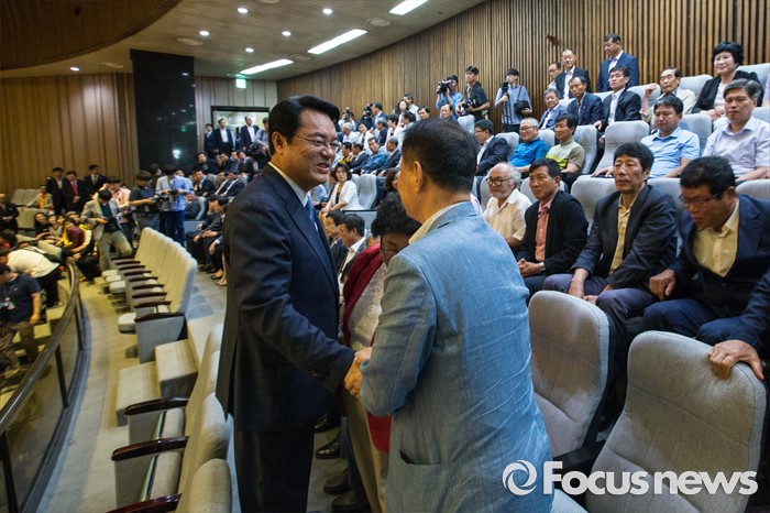 (서울=포커스뉴스) 정진석 새누리당 원내대표가 20일 오전 서울 여의도 국회에서 열린 본회의를 마친 뒤 정 원내대표의 교섭단체 대표연설을 방청하기 위해 본회의장을 찾은 충남 공주시 지역구 주민들과 인사 하고 있다.