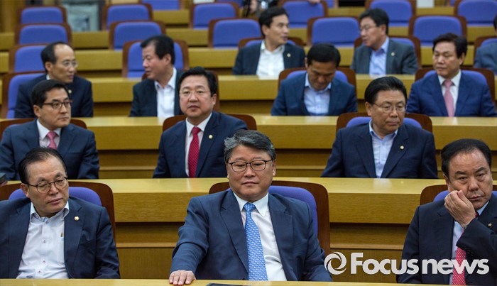 (서울=포커스뉴스) 조원진(가운데) 새누리당 의원을 비롯한 친박계 초재선 의원들이 20일 오후 서울 여의도 국회의원회관에 모여 간담회 시작을 기다리고 있다.