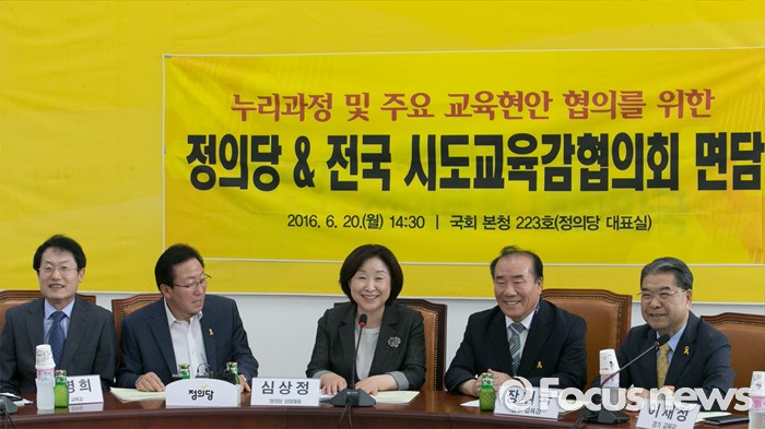 (서울=포커스뉴스) 심상정 정의당 상임대표가 20일 오후 서울 여의도 국회에서 전국시도교육감협의회와 간담회를 하고 있다. 왼쪽부터 조희연 서울시교육감, 민병희 강원도교육감, 심 대표, 장휘국 전국시도교육감협의회장(광주시교육감), 이재정 경기도교육감.