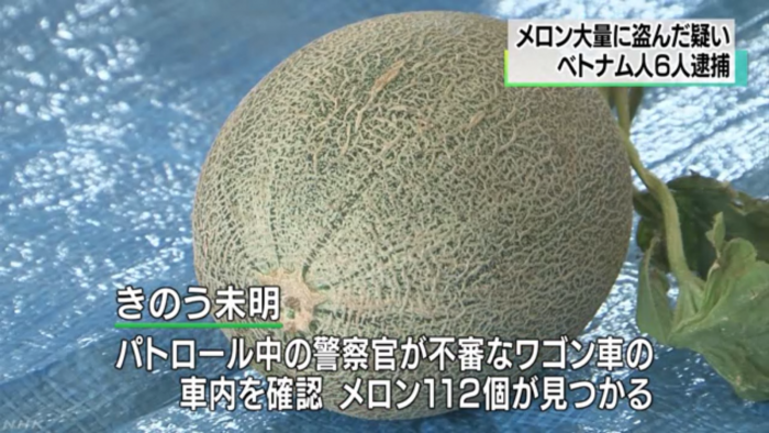 일본 NHK는 20일 "일본 치바현 아사히시에서 베트남인 6명이 19일 새벽 멜론 112개를 훔친 혐의로 체포됐다"고 보도했다.