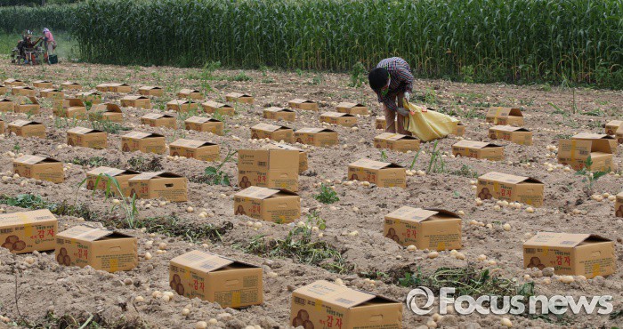 (괴산-포커스뉴스) 장마철을 앞두고 20일 오후 충북 괴산군 들녘에서 농민들이 감자를 수확하고 있다.