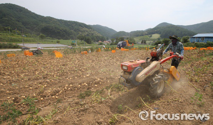 (괴산-포커스뉴스) 장마철을 앞두고 20일 오후 충북 괴산군 들녘에서 농민들이 감자를 수확하고 있다.