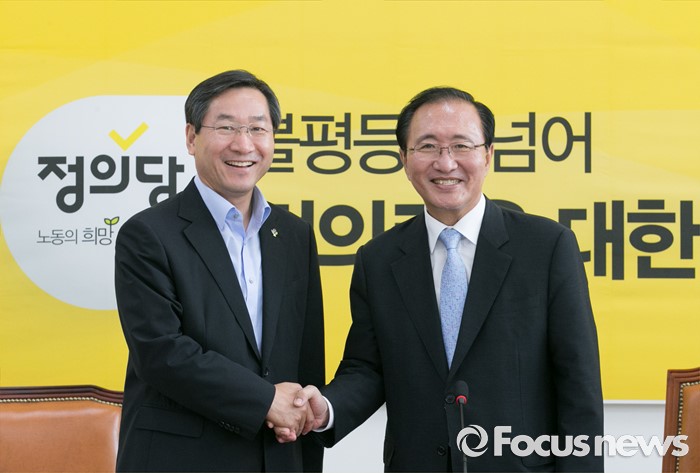 (서울=포커스뉴스) 노회찬(오른쪽) 정의당 원내대표가 20일 오후 서울 여의도 국회를 방문한 유정복 인천시장과 서해5도 지원 특별법 등과 관련 면담에 앞서 포즈를 취하고 있다.