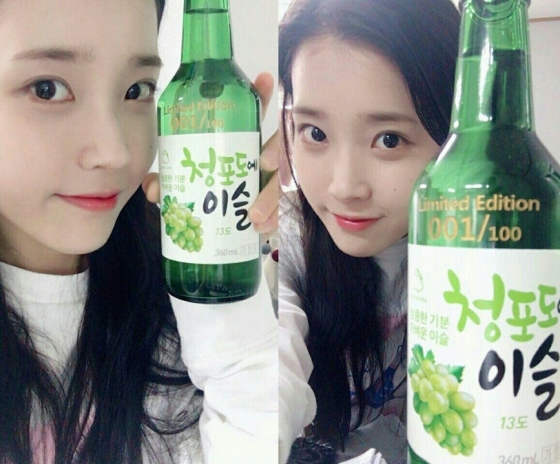 (서울=포커스뉴스) 가수 아이유의 '청포도에이슬' 한정판 1호 인증샷이 화제다.