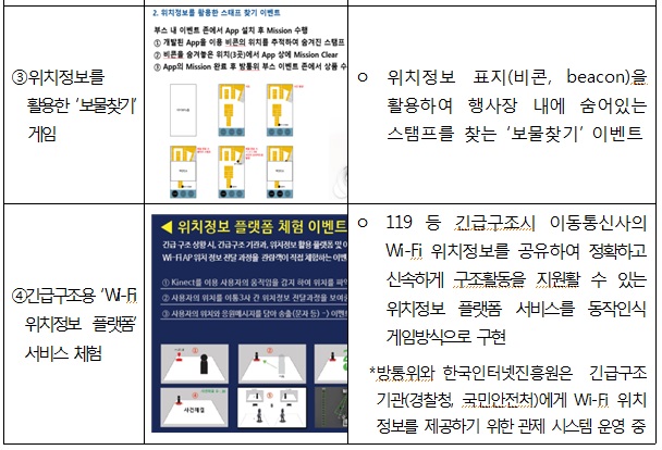 위치정보 활용서비스 체험관에서는 안전·엔터테인먼트·게임 등 다양한 분야에서 위치정보를 활용하는 대표적인 서비스를 소개하고 위치정보 표지(비콘, beacon)를 활용해 행사장 내에 숨겨져 있는 스탬프를 모으는 ‘보물찾기 게임’, 119 등 긴급구조시 위치정보가 어떻게 활용되는지를 체험할 수 있는 ‘와이파이(Wi-Fi) 위치정보 플랫폼’ 등 다양한 콘텐츠를 직접 체험해 볼 수 있다.