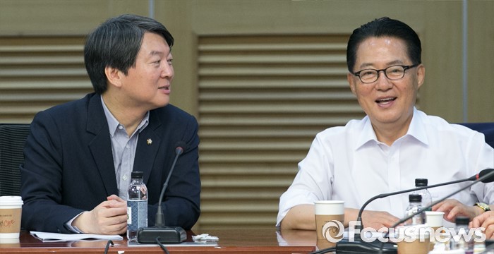 (서울=포커스뉴스) 21일 오전 서울 여의도 국회 의원회관에서 열린 국민의당 17차 정책역량강화 워크숍에 참석한 안철수(왼쪽) 상임공동대표, 박지원 원내대표가 대화하고 있다.