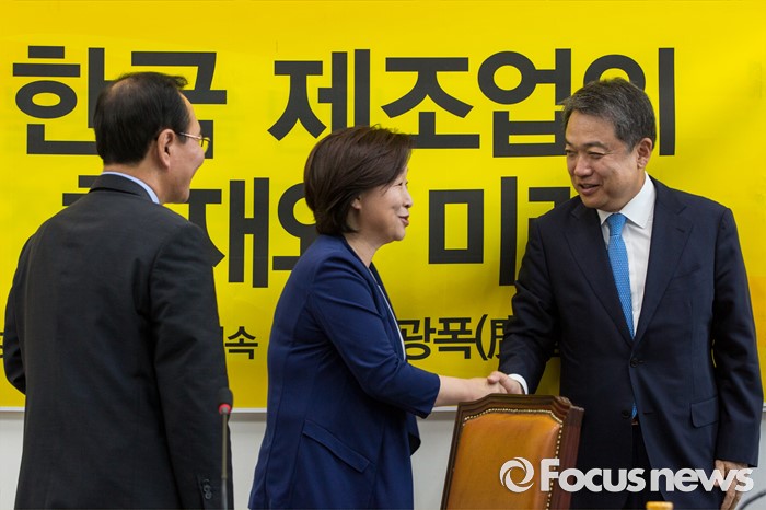 (서울=포커스뉴스) 심상정(가운데) 정의당 상임공동대표와 정진행(오른쪽) 현대자동차 사장이 21일 오전 서울 여의도 국회에서 열린 '정의당 광폭경청'에 참석해 악수 하고 있다.