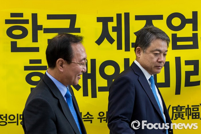 (서울=포커스뉴스) 노회찬(왼쪽) 정의당 원내대표와 정진행 현대자동차 사장이 21일 오전 서울 여의도 국회에서 열린 '정의당 광폭경청'에 참석해 인사한 뒤 자리로 이동 하고 있다.