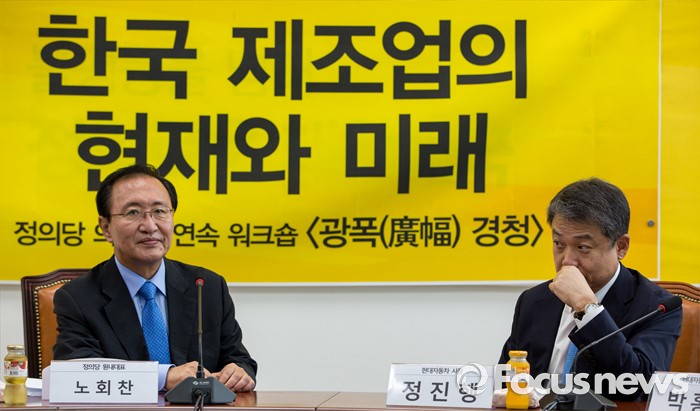 (서울=포커스뉴스) 노회찬(왼쪽) 정의당 원내대표와 정진행 현대자동차 사장이 21일 오전 서울 여의도 국회에서 열린 '정의당 광폭경청'에 참석 하고 있다.