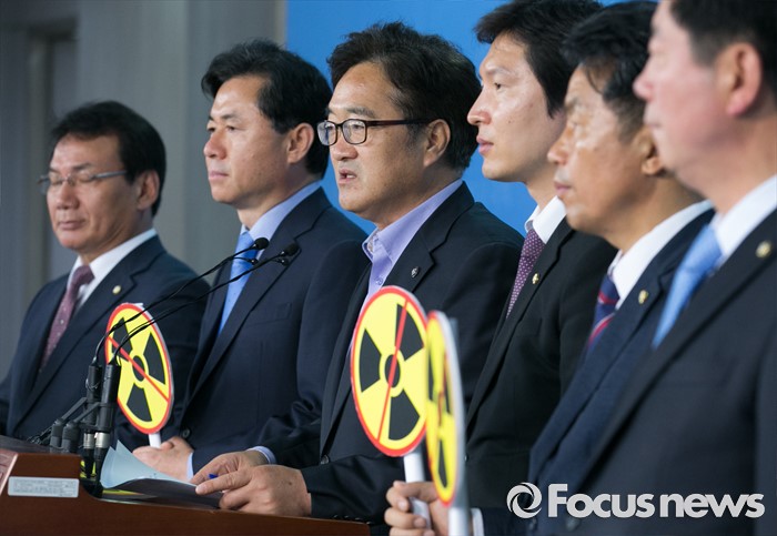 (서울=포커스뉴스) 21일 오전 서울 여의도 국회 정론관에서 탈핵·에너지전환 국회의원 모임이 신고리 원전 5, 6호기 건설 중단 촉구 기자회견을 하고 있다. 왼쪽부터 서형수, 김영춘, 우원식, 김해영 더불어민주당 의원, 윤종오 무소속 의원, 박재호 더불어민주당 의원.