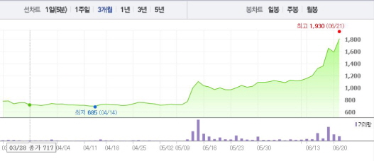 이는 11일 전 주가인 10일(1125원)과 비교했을 때 무려 61.3% 상승한 수치다.