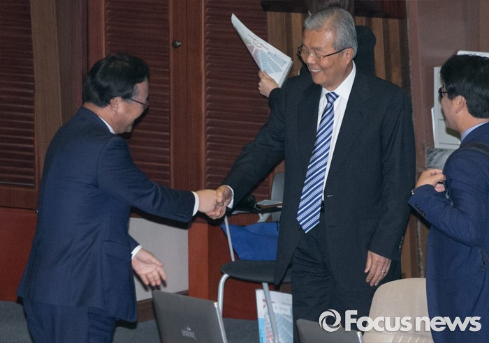 (서울=포커스뉴스) 21일 오전 서울 여의도 국회에서 열린 343회 국회(임시회) 4차 본회의에 참석한 김종인(가운데) 더불어민주당 비대위 대표와 김부겸(왼쪽) 의원이 인사하고 있다.