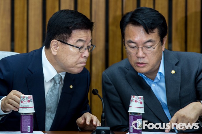 (서울=포커스뉴스) 정진석 새누리당 원내대표와 김광림 정책위의장이 21일 오전 서울 여의도 국회에서 열린 원내대책회의에 참석해 대화 하고 있다.