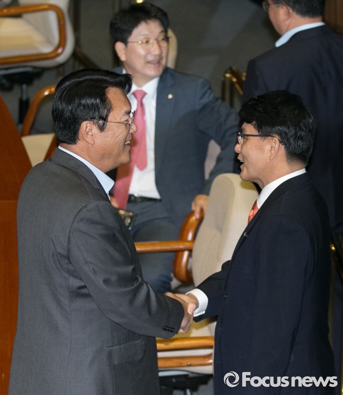 (서울=포커스뉴스) 21일 오전 서울 여의도 국회에서 열린 343회 국회(임시회) 4차 본회의에 참석한 정진석(왼쪽) 새누리당 원내대표와 윤상현 의원이 인사하고 있다.