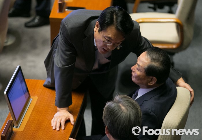 (서울=포커스뉴스) 21일 오전 서울 여의도 국회에서 열린 343회 국회(임시회) 4차 본회의에 참석한 정진석 새누리당 원내대표와 서청원 전 최고위원이 대화하고 있다.