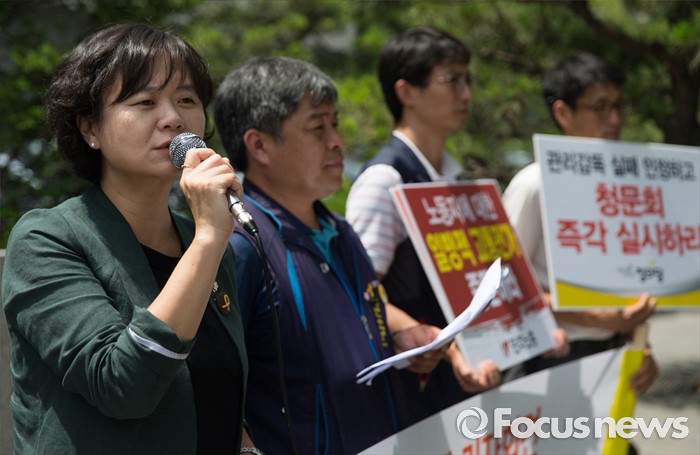 (서울=포커스뉴스) 21일 오전 서울 영등포구 산업은행 본점 앞에서 열린 조선해운업 구조조정 관련 정부와 금융당국, 산업은행 규탄 기자회견에서 이정미(왼쪽) 정의당 원내수석부대표가 모두발언 하고 있다.