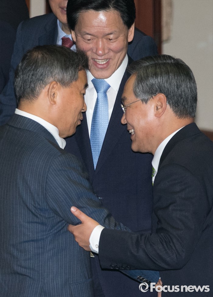 (서울=포커스뉴스) 21일 오전 서울 여의도 국회에서 열린 343회 국회(임시회) 4차 본회의에 참석한 우윤근(오른쪽) 신임 국회 사무총장이 황주홍(왼쪽), 주승용 국민의당 의원과 악수하고 있다.