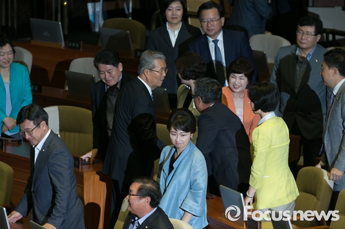 (서울=포커스뉴스) 21일 오전 서울 여의도 국회에서 열린 343회 국회(임시회) 4차 본회의에 참석한 김종인 더불어민주당 비대위 대표가 교섭단체 대표연설을 마친 뒤 의원들과 인사하고 있다.