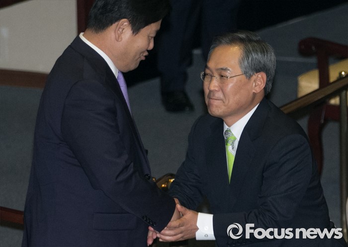 (서울=포커스뉴스) 21일 오전 서울 여의도 국회에서 열린 343회 국회(임시회) 4차 본회의에 참석한 우윤근(오른쪽) 신임 국회 사무총장이 홍의락 무소속 의원과 악수하고 있다.