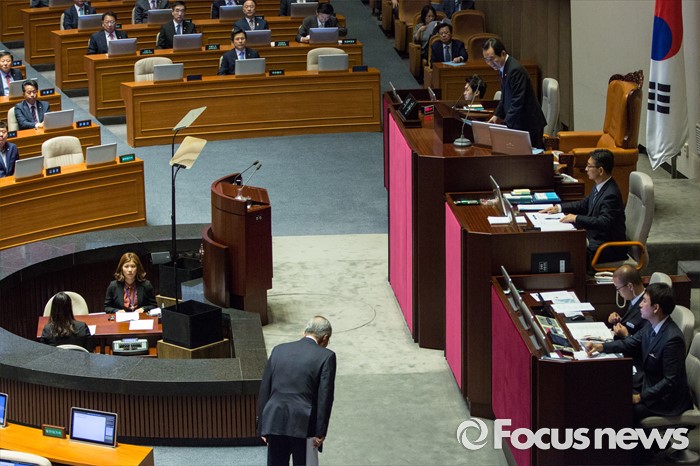 (서울=포커스뉴스) 김종인 더불어민주당 비상대책위 대표가 21일 오전 서울 여의도 국회에서 열린 본회의에 참석해 교섭단체대표 연설을 마친 뒤 정세균 국회의장에게 인사하고 있다.