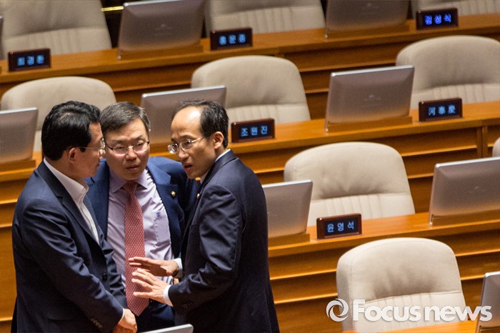 (서울=포커스뉴스) 추경호(오른쪽) 새누리당 의원이 21일 오전 서울 여의도 국회에서 열린 본회의에 참석해 동료 의원들과 대화 하고 있다.