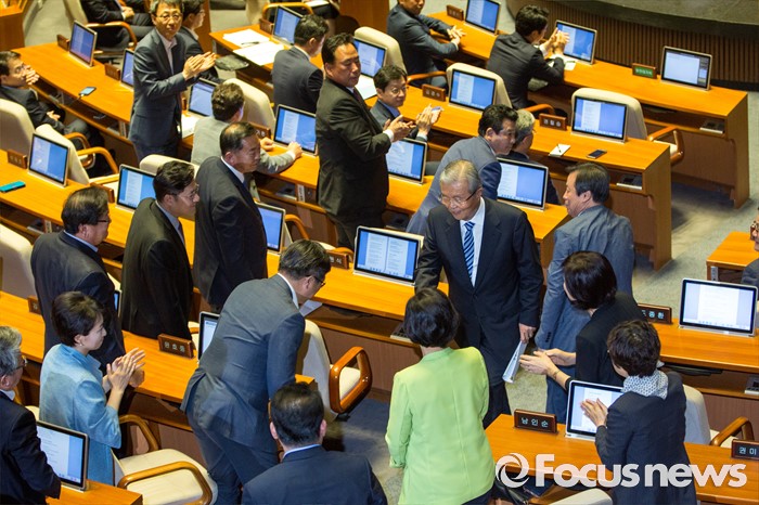 (서울=포커스뉴스) 김종인 더불어민주당 비상대책위 대표가 21일 오전 서울 여의도 국회에서 열린 본회의에 참석해 교섭단체대표 연설을 마친 뒤 동료 의원들과 인사 하고 있다.
