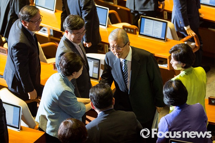 (서울=포커스뉴스) 김종인 더불어민주당 비상대책위 대표가 21일 오전 서울 여의도 국회에서 열린 본회의에 참석해 교섭단체대표 연설을 마친 뒤 동료 의원들과 인사 하고 있다.