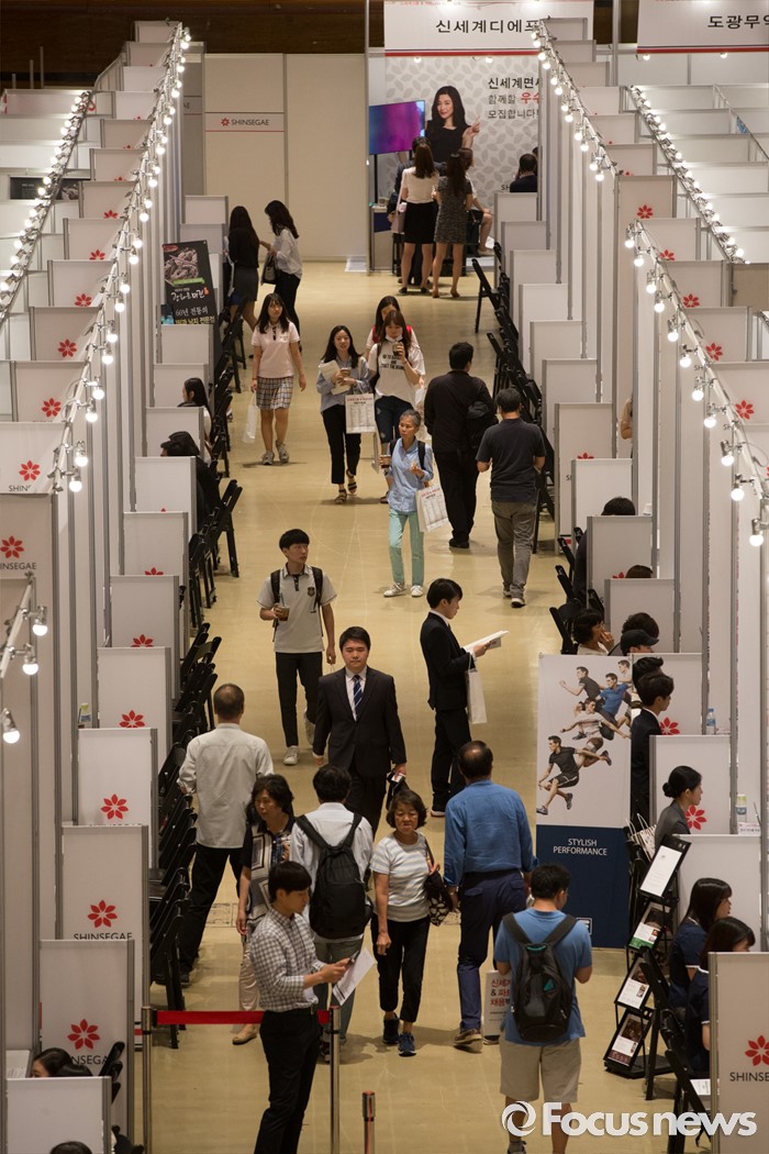 (서울=포커스뉴스) 21일 오후 서울 강남구 코엑스 D2홀에서 열린 신세계그룹&파트너사 채용박람회에서 구직자들이 희망 부스를 둘러보고 있다.