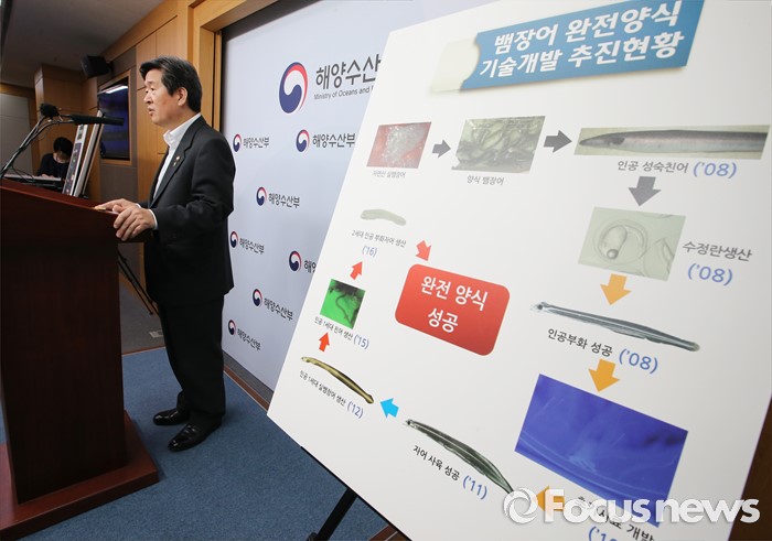 (세종=포커스뉴스) 윤학배 해양수산부 차관이 21일 오전 세종시 정부세종청사 해수부 기자실에서 뱀장어 완전양식 기술 세계 2번째 개발성공 브리핑을 하고 있다.