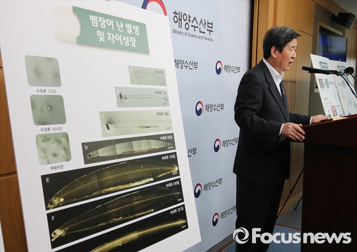 (세종=포커스뉴스) 윤학배 해양수산부 차관이 21일 오전 세종시 정부세종청사 해수부 기자실에서 뱀장어 완전양식 기술 세계 2번째 개발성공 브리핑을 하고 있다.