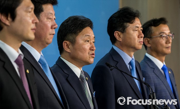 (서울=포커스뉴스) 21일 오후 서울 여의도 국회 정론관에서 최인호 더불어민주당 의원이 영남권 신공항 결과 발표 관련 기자회견을 하고 있다. 왼쪽부터 김해영, 박재호, 최인호, 김영춘, 전재수 의원.