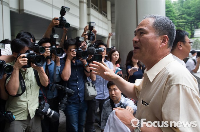 (서울=포커스뉴스) 21일 오후 서울 서초구 서울중앙지방법원 앞에서 보수단체 대한민국 구국채널 회원이 국가정보원 상대 북한 식당종업원 인신구제청구 소송 관련 민주사회를 위한 변호사모임을 규탄하고 있다.
