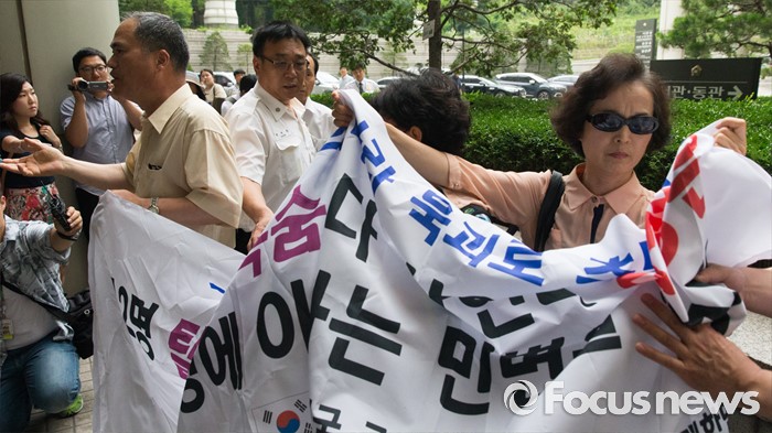 (서울=포커스뉴스) 21일 오후 서울 서초구 서울중앙지방법원 앞에서 보수단체 대한민국 구국채널 회원들이 국가정보원 상대 북한 식당종업원 인신구제청구 소송 관련 민주사회를 위한 변호사모임을 규탄하는 현수막을 펼치던 중 법원 관계자들에게 저지당하고 있다.
