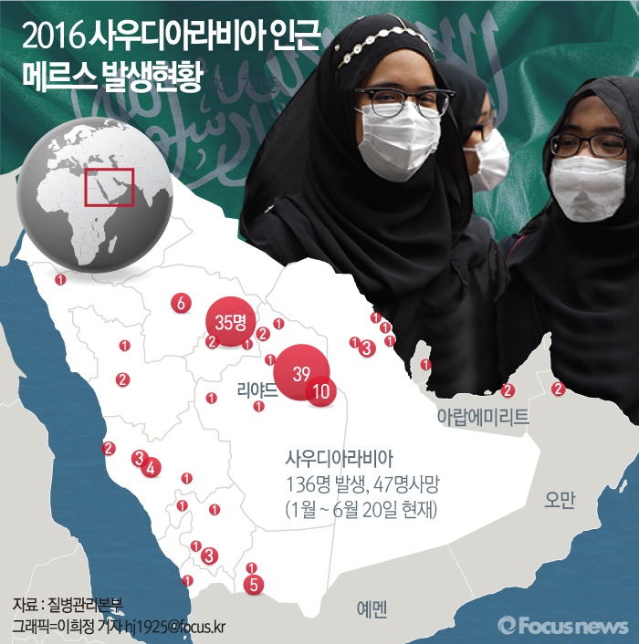 (서울=포커스뉴스) 21일 질병관리본부에 따르면 2016년 1월부터 6월 20일까지 사우디아라비아에서 총 136명의 메르스 환자가 발생했고 47명이 사망했다. 전 세계적으로 메르스는 2016년 1월 이후 중동지역에서만 발생 중이다. 보건당국은 중동국가 여행 시 메르스 예방수칙을 준수를 당부했다.
