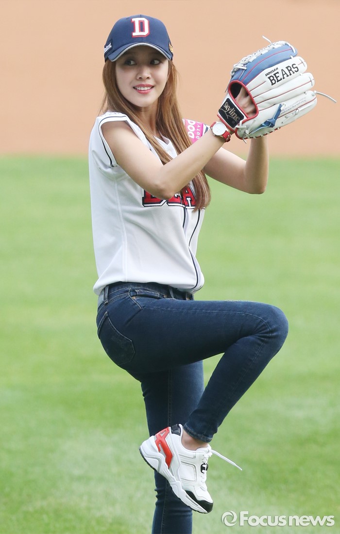 (서울=포커스뉴스) 21일 서울 잠실구장에서 열린 2016 프로야구 kt-두산 경기에서 배우 조보아가 시구하고 있다.