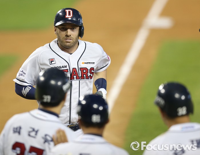 (서울=포커스뉴스) 12일 서울 잠실구장에서 열린 2016 프로야구 kt-두산 경기 4회말 1사후 두산 에반스가 만루홈런을 치고 선행주자들의 환영을 받으며 홈인하고 있다.