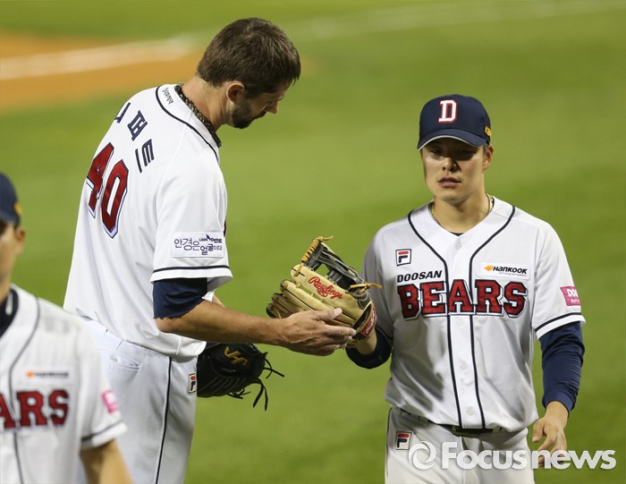 (서울=포커스뉴스) 12일 서울 잠실구장에서 열린 2016 프로야구 kt-두산 경기에서 두산 투수 니퍼트가 6회 수비를 마치고 공수교대하며 우익수 민병헌을 맞이하고 있다.