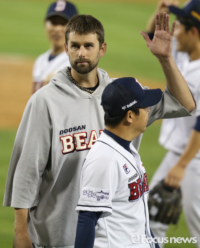 (서울=포커스뉴스) 12일 서울 잠실구장에서 열린 2016 프로야구 kt-두산 경기에서 6회까지 한 명의 주자도 내보내지 않는 퍼펙트 피칭을 한 두산 투수 니퍼트가 경기를 마치고 관중석의 부인을 향해 손을 흔들고 있다.
