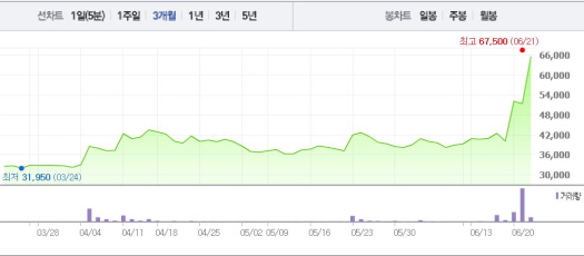 부산산업은 22일 오전 9시10분 현재 전일 대비 28.02%(1만4400원) 상승한 6만5800원에 거래되고 있다. 부산산업은 21일 1.34%의 낙폭을 기록했지만 20일, 외국인이 매수에 나서면서 가격제한폭인 29.93%의 상승폭을 기록했다.