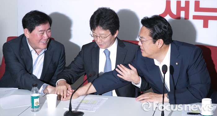 (서울=포커스뉴스) 22일 오전 서울 여의도 국회에서 열린 새누리당 신공항 관련 5개 시도 중진의원 간담회에 참석한 정진석(오른쪽부터) 원내대표, 유승민, 최경환 의원이 민경욱 원내대변인의 제안으로 손을 맞잡고 있다.