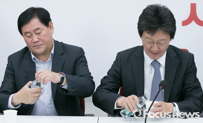 (서울=포커스뉴스) 22일 오전 서울 여의도 국회에서 열린 새누리당 신공항 관련 5개 시도 중진의원 간담회에 참석한 최경환(왼쪽), 유승민 의원이 물을 마실 준비를 하고 있다.