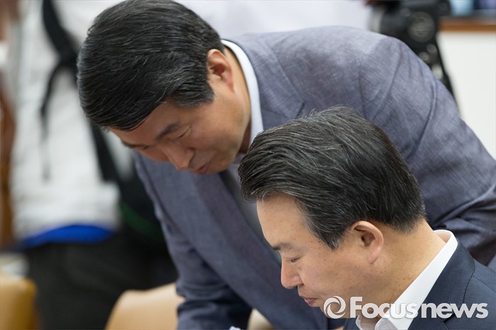 (서울=포커스뉴스) 22일 오전 서울 종로구 정부서울청사에서 열린 '제7차 사회관계장관회의'에 참석한 강신명(오른쪽) 경찰청장이 회의를 준비하고 있다.