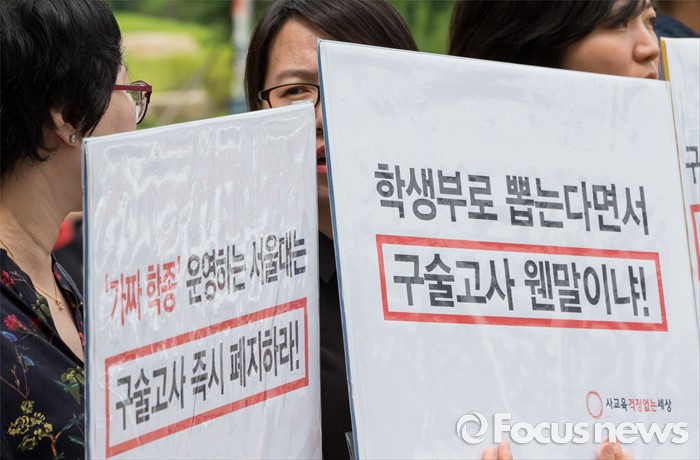 (서울=포커스뉴스) 22일 오전 서울대학교 정문 앞에서 시민단체 '사교육걱정없는세상' 회원들이 '2016학년도 서울대 수시 일반전형 구술고사 관련 실태 발표' 기자회견을 열고 있다.