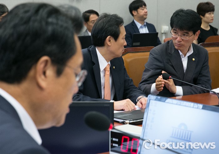 (서울=포커스뉴스) 22일 오전 서울 여의도 국회에서 열린 운영위원회 전체회의에 참석한 우상호(가운데) 더불어민주당 원내대표와 박완주 간사가 대화하고 있다. 왼쪽은 위원장인 정진석 새누리당 원내대표.