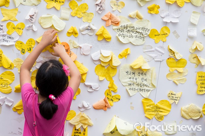 (서울=포커스뉴스) 22일 오후 서울 종로구 옛 일본대사관 앞에서 열린 제1236차 일본군 위안부 문제해결을 위한 정기수요집회에서 한 어린이가 할머니들에게 보내는 메시지를 살펴보고 있다.