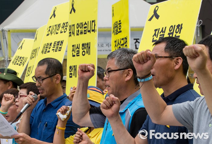 (서울=포커스뉴스) 세월호 참사 800일을 하루 앞둔 22일 오전 서울 종로구 광화문 광장에서 열린 '세월호 특별법 개정 촉구와 800일 계기수업 선포' 기자회견에 참석한 전국교직원노동조합 조합원들이 구호를 외치고 있다.